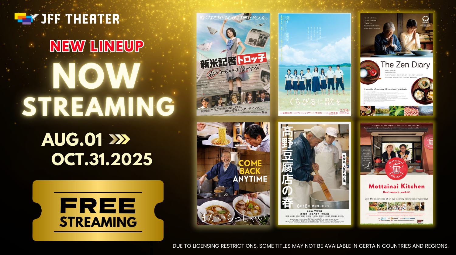 The Japan Foundation continúa publicando nuevos contenidos en la plataforma de streaming JFF Theater, que busca popularizar aún más el cine y el audiovisual japonés en todo el mundo. Desde el 1 de agosto y hasta el 31 de octubre de 2025, podremos ver en España seis nuevos largometrajes de forma completamente gratuita en versión original en japonés con subtítulos en español.