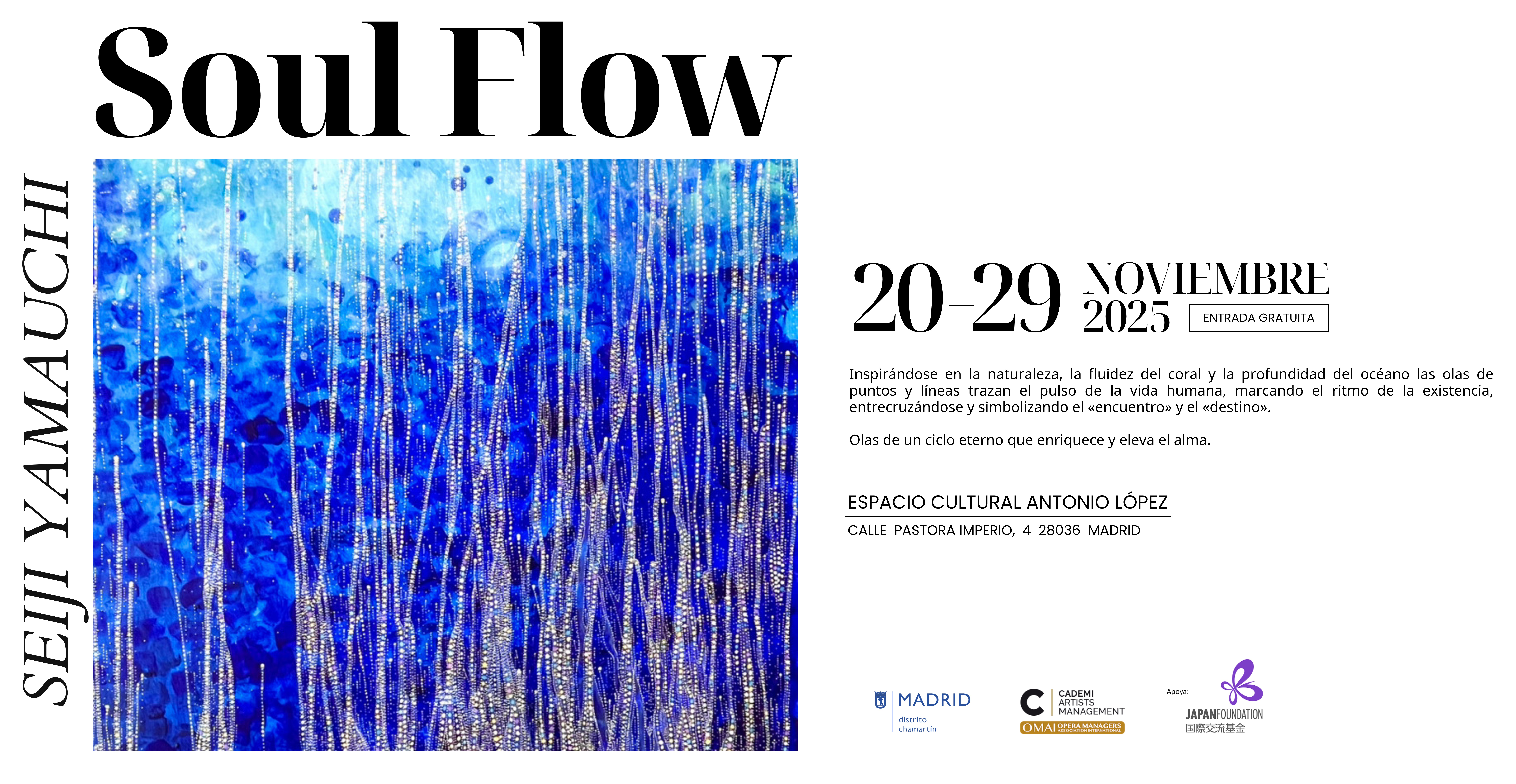 Del 20 al 29 de noviembre se celebra la exposición "Soul Flow" del artista japonés Seiji Yamauchi, que constituye la primera muestra que se podrá visitar en el recién estrenado Espacio Cultural Antonio López del Ayuntamiento de Madrid (distrito Chamartín). La inauguración tendrá lugar el jueves 20 de noviembre a las 18:30 y contará con la presencia del propio artista.