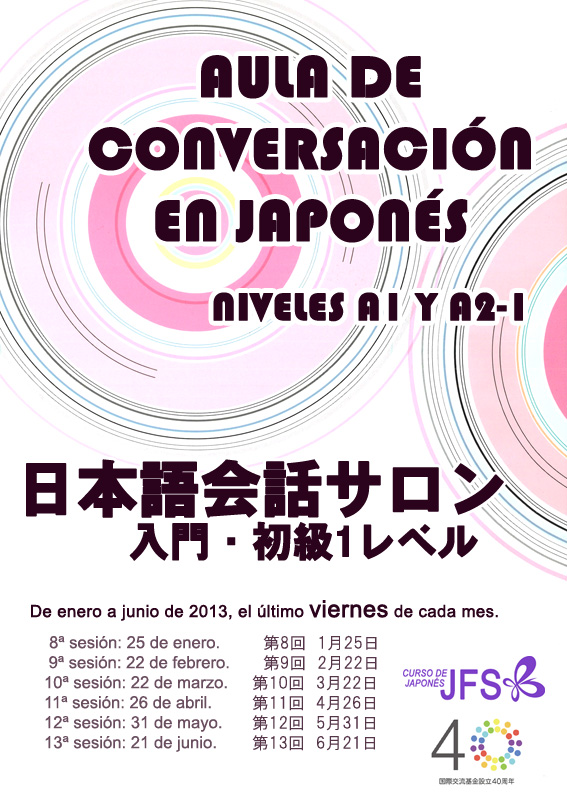 Fundación Japón, Madrid, organiza mensualmente en su sede un aula de conversación para estudiantes de nivel inicial y nativos japoneses. A partir del año 2013 el nivel de los estudiantes abarca desde el nivel A1 (inicial) al nivel A2-1 (básico 1). Los alumnos se dividirán en dos grupos dependiendo del nivel. Si lleváis entre 0 y 2 años estudiando japonés, ¡apuntaos!